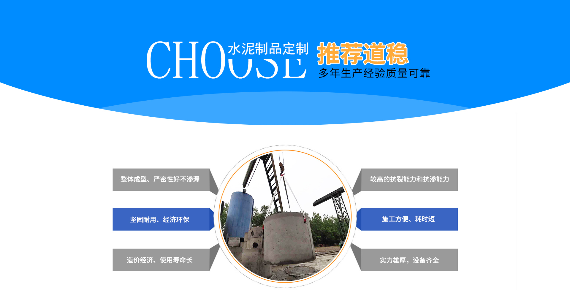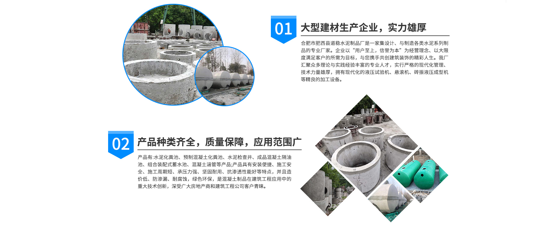 合肥市肥西縣道穩水泥制品廠是一家集設計、與制造各類水泥系列制品的專業廠家。產品有:水泥化糞池、預制混凝土化糞池、水泥檢查井、成品混凝土隔油池、組合裝配式蓄水池、混凝土涵管等產品;產品具有安裝便捷、施工安全、施工周期短、承壓力強、堅固耐用、抗滲透性能好等特點,并且造價低、防滲漏、耐腐蝕,綠色環保,是混凝土制品在建筑工程應用中的重大技術創新,深受廣大房地產商和建筑工程公司客戶青睞。